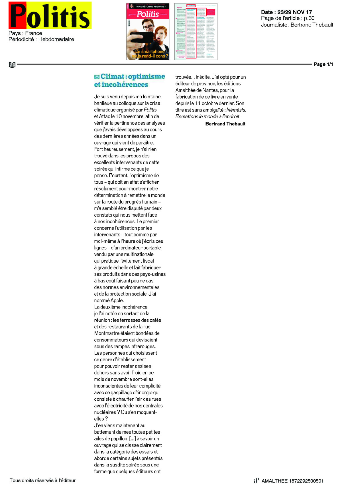 Le premier s’est produit mercredi lorsque l’hebdomadaire Politis a, contre toute attente, publié dans ses colonnes un commentaire que je leur avais adressé suite à un colloque organisé par ce journal avec ATTAC sur la crise climatique le 10 novembre dernier. Du même coup, Politis est devenu le premier journal à mentionner la publication de Némésis (voir article joint).