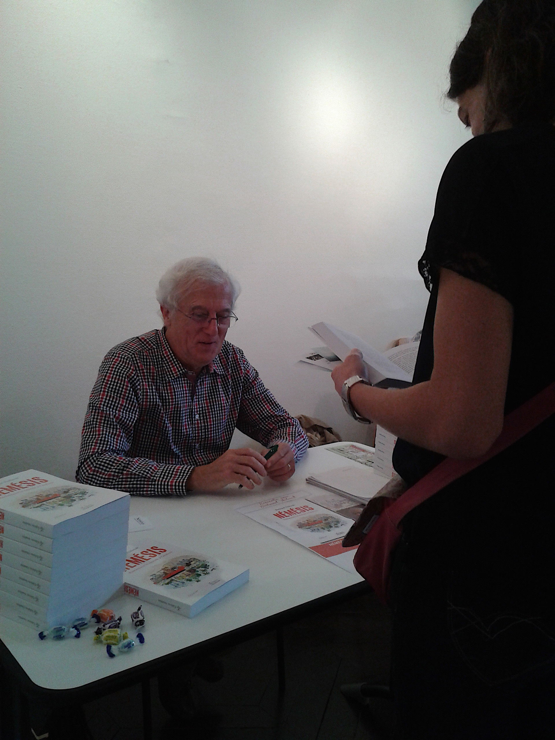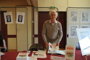 Le lendemain, dimanche 14 octobre, je devais participer au 7ème Salon régional du Livre dédicacé de Moret-sur-Loing, charmante petite commune de Seine-et-Marne où vécut le peintre Sisley. Les anciens ouvrages hydrauliques construits sur la rivière pour alimenter plusieurs moulins donnent son cachet très particulier au centre de la bourgade. Dès dix heures du matin, nous étions rassemblés dans la salle des fêtes, mais le temps passait et les allées restaient désespérément désertes ; à tout le moins, la fréquentation du public demeurait-elle tout à fait confidentielle, les auteurs voyant dans la température estivale régnant à l’extérieur un bouc émissaire à qui faire porter cette indifférence pour une activité qui avait sans doute du mal à rivaliser avec une promenade en forêt de Fontainebleau ou sur les rives du Loing ; et les organisateurs de s’interroger eux-mêmes sur le jour du week-end le plus pertinent pour organiser la 8ème édition de ce salon : samedi ou dimanche ? J’eus néanmoins l’agréable surprise de voir mon livre recevoir les éloges de l’un des membres du jury, le Dr Noël, lorsqu’il remit un exemplaire de NÉMÉSIS à Agnès Sarto